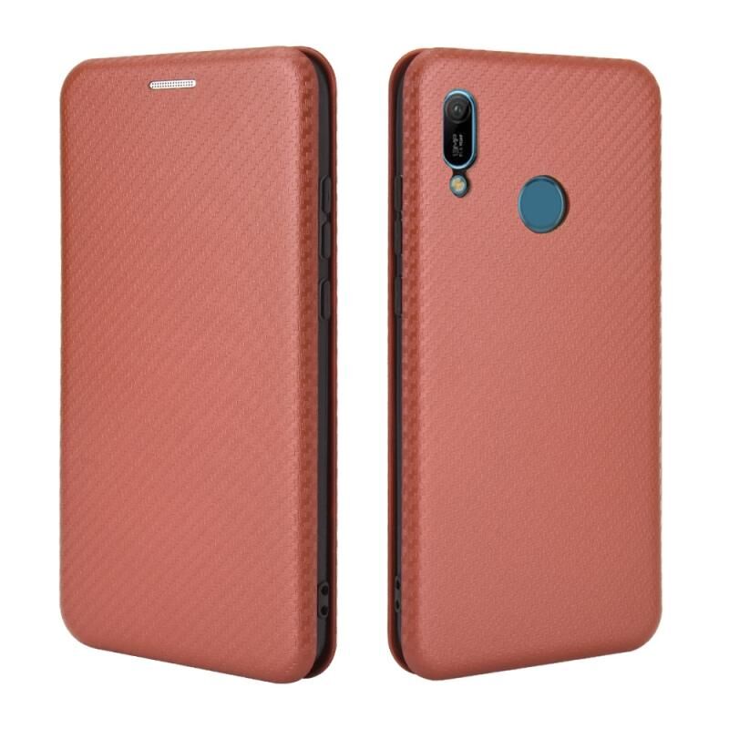 Θήκη οριζόντιας αναδίπλωσης για Huawei Y6 (2019) / Honor Y6s με υφή ανθρακονήματος, κατασκευασμένη από TPU + PC + Δερματίνη PU με υποδοχή για κάρτες (Καφέ)