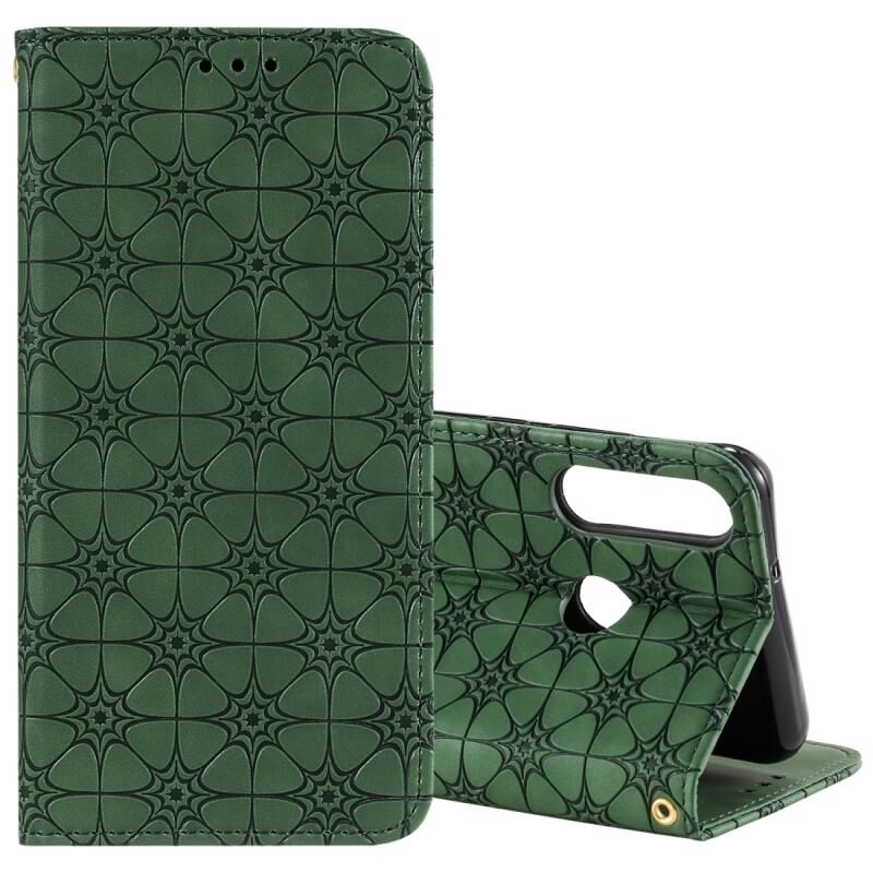 Θήκη Huawei Y6p (2020) με μαγνητικό κλείσιμο, δερμάτινη, οριζόντια, με ανάγλυφο σχέδιο τυχερών λουλουδιών, με βάση στήριξης & θήκες για κάρτες (Σκούρο Πράσινο)