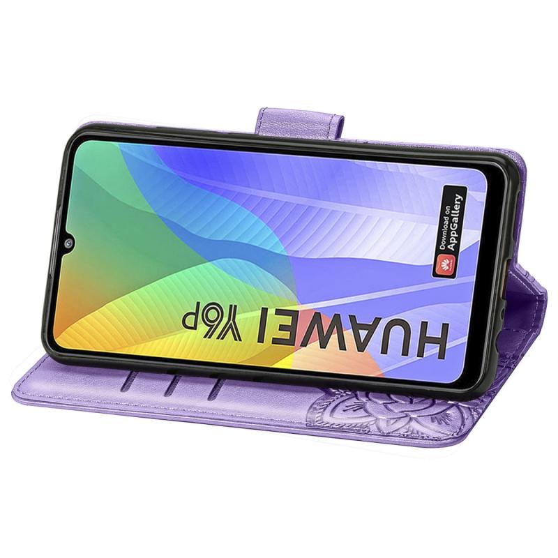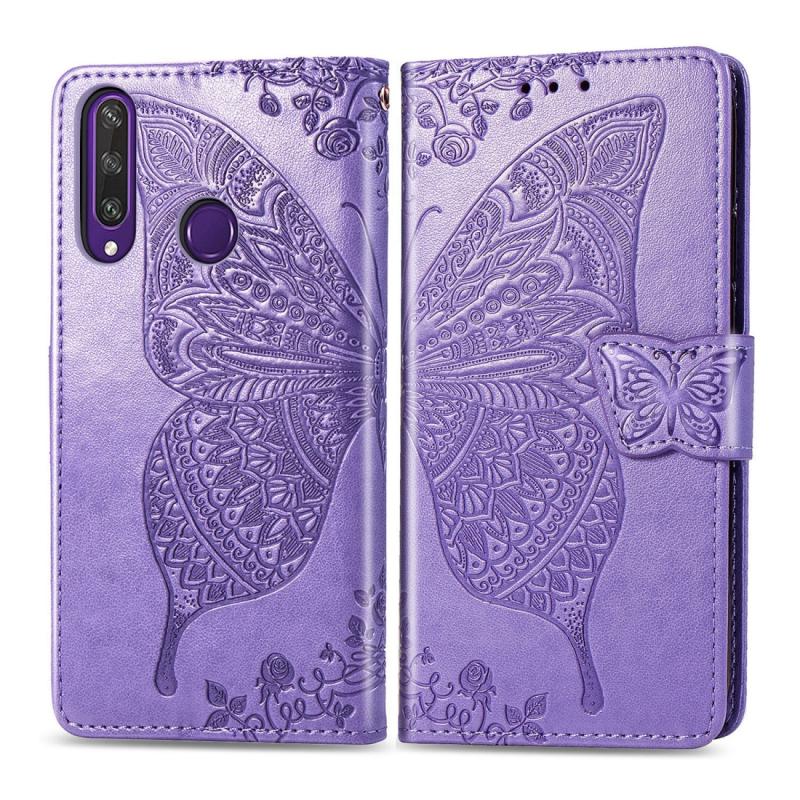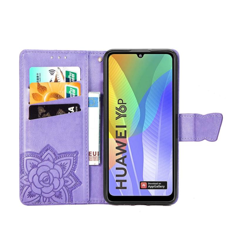 Θήκη Huawei Y6P Butterfly Love Λουλουδάτη ανάγλυφη οριζόντια δερμάτινη με βάση / Θήκη καρτών / Πορτοφόλι / Λουρί (Μαύρο)