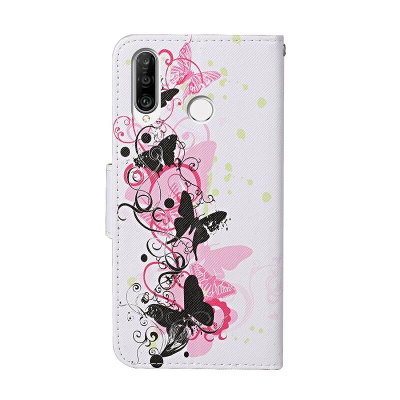 Θήκη δέρματος οριζόντιας αναδίπλωσης με σχέδιο ζωγραφικής και χρώματα για Huawei Y6p με βάση στήριξης & υποδοχές καρτών & πορτοφόλι (Τέσσερα Πεταλούδες)