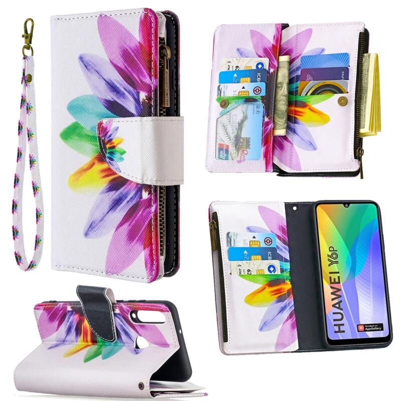 Θήκη Huawei Y6p με έγχρωμα σχέδια, οριζόντια αναδιπλούμενη από δέρμα με φερμουάρ, βάση στήριξης & θήκες για κάρτες & πορτοφόλι (Κόκκινο)