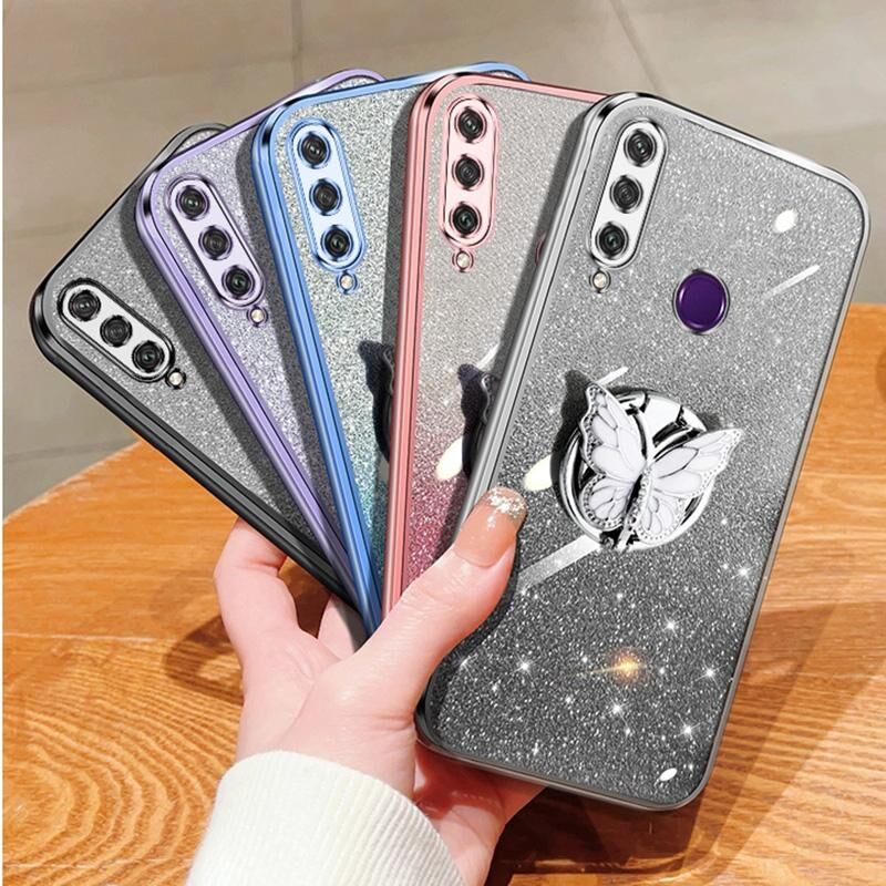 Θήκη κινητού τηλεφώνου Huawei Y6p με επιμετάλλωση, διαβαθμισμένη λάμψη, πεταλούδα (Ροζ)