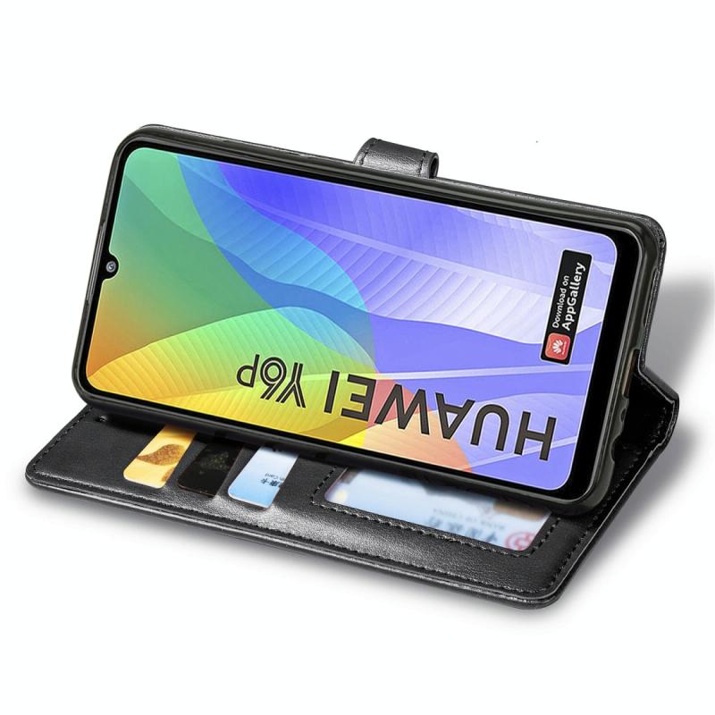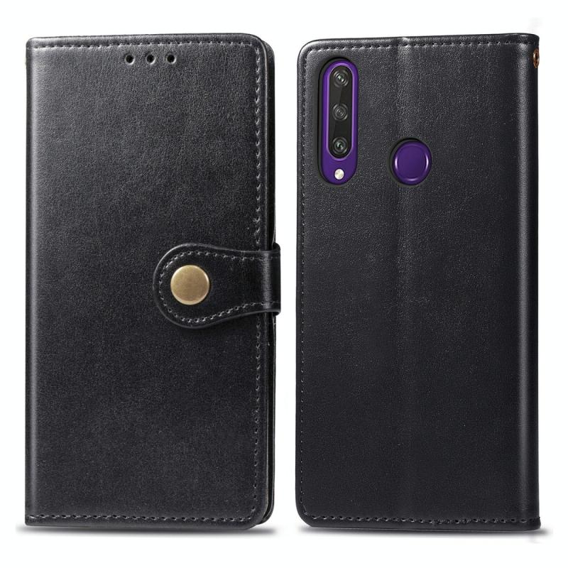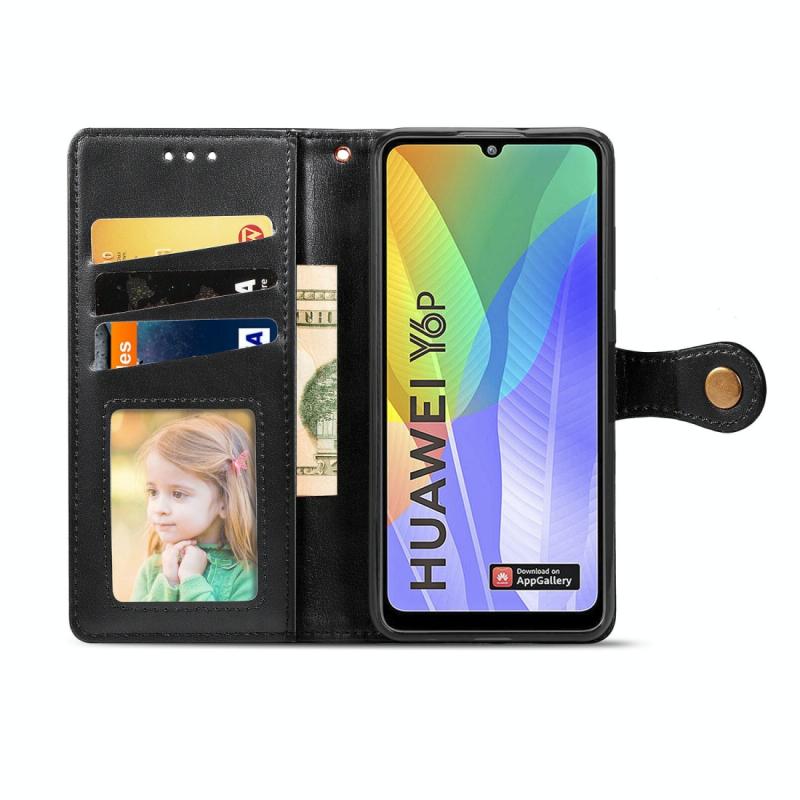 For Huawei Y6P Retro Solid Color Leather Buckle Phone Case with Lanyard & Photo Frame & Card Slot & Wallet & Stand Function(Black)