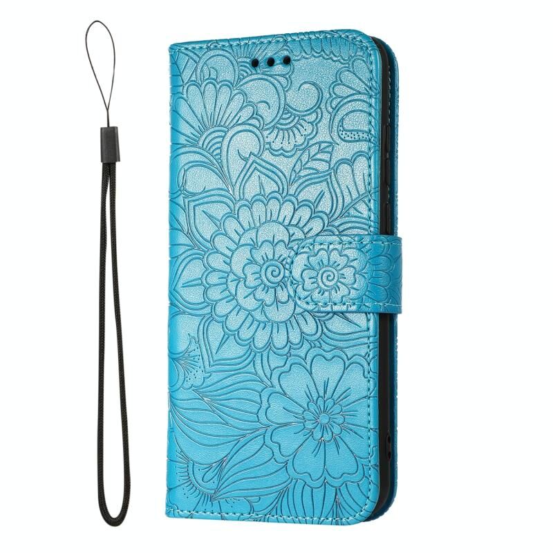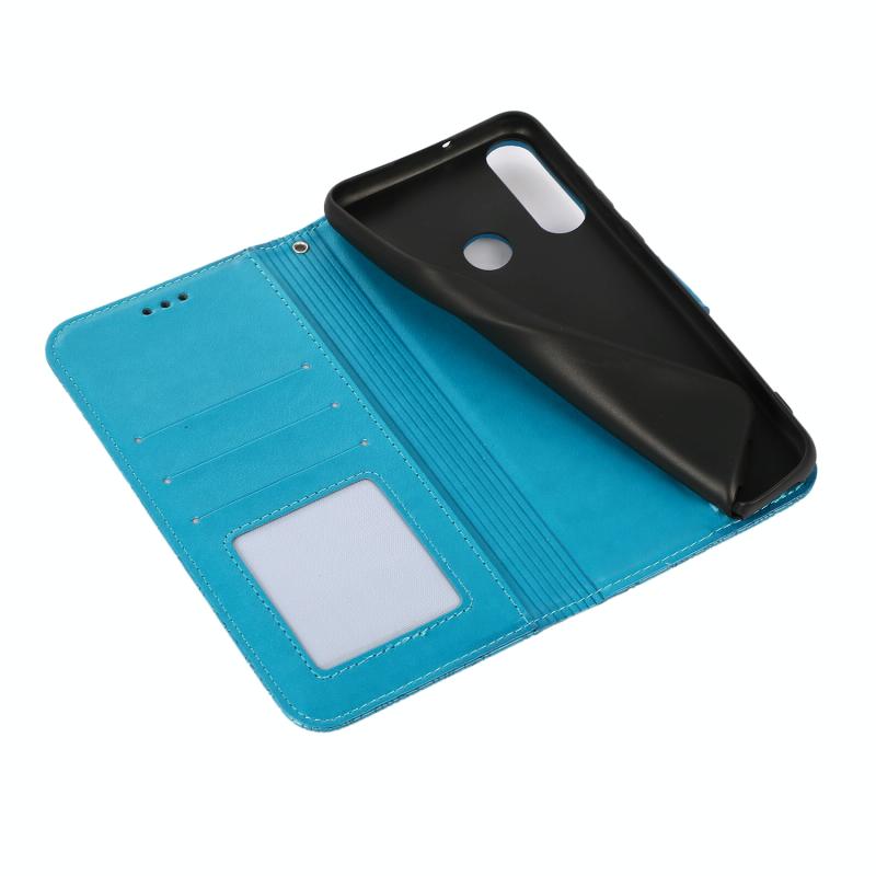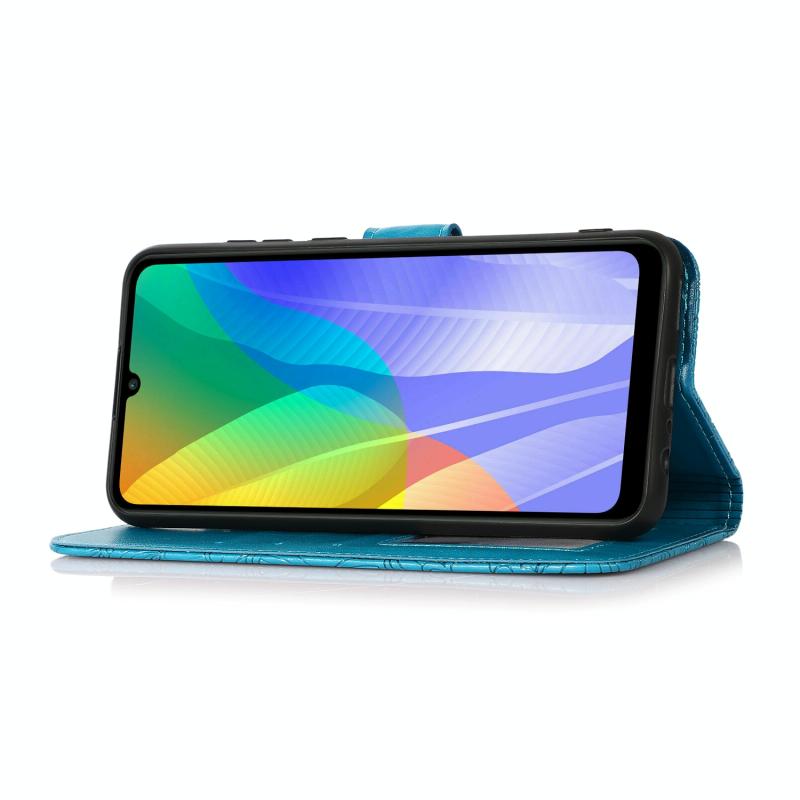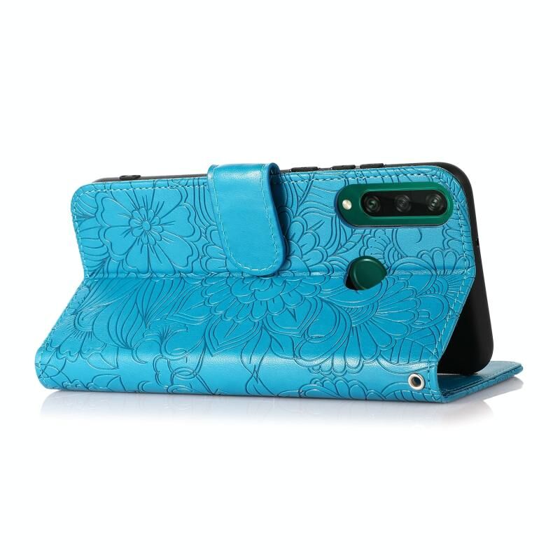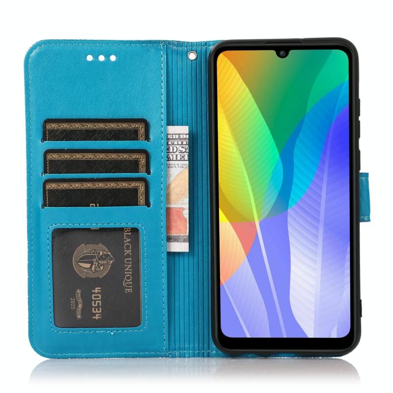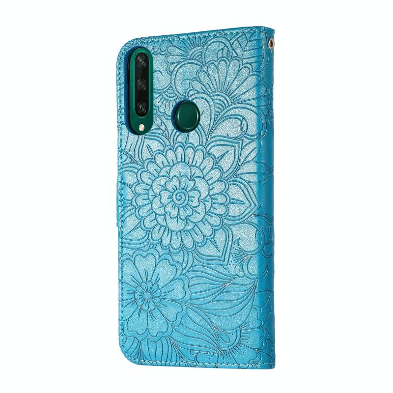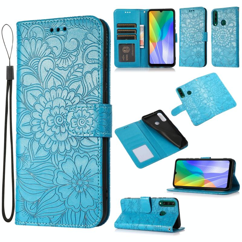 Θήκη Huawei Y6p με υφή δέρματος, ανάγλυφο ηλιοτρόπιο, οριζόντια, δερμάτινη με βάση στήριξης, θήκες καρτών, πορτοφόλι & λουρί (Μπλε)
