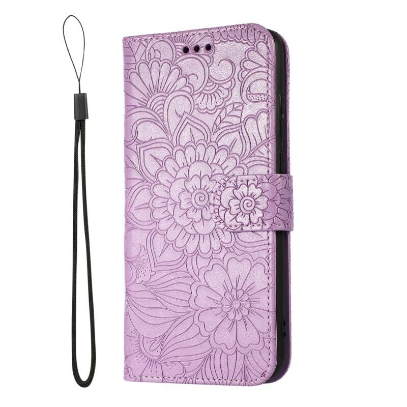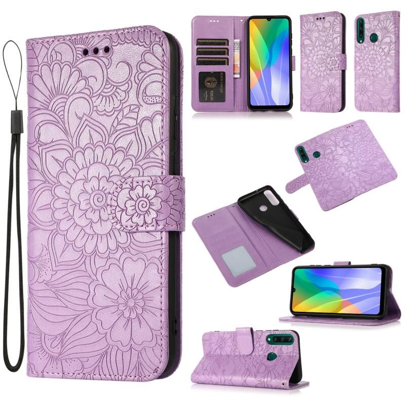 Για Huawei Y6p δέρμα αίσθηση ανάγλυφο ηλιοτρόπιο οριζόντια Flip δερμάτινη θήκη με κάτοχο & υποδοχές καρτών & πορτοφόλι & κορδόνι (μωβ)