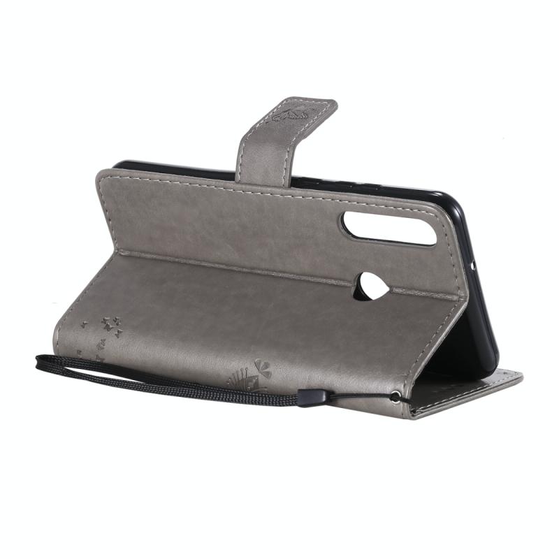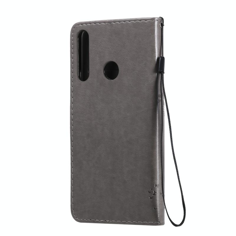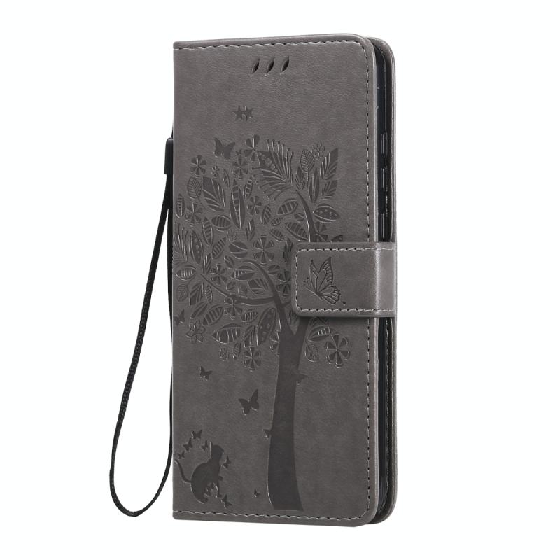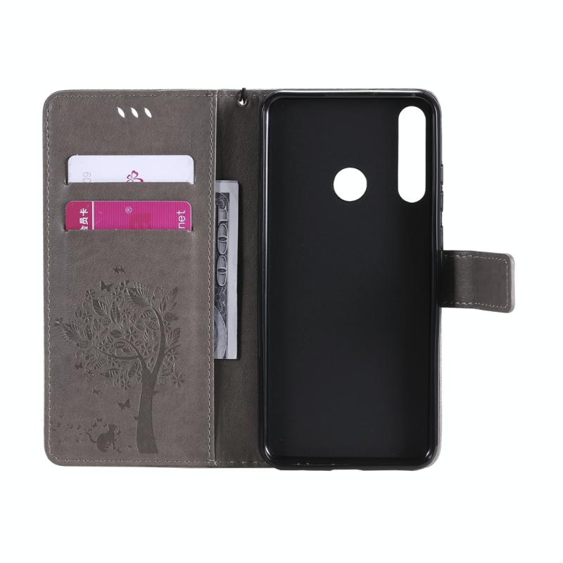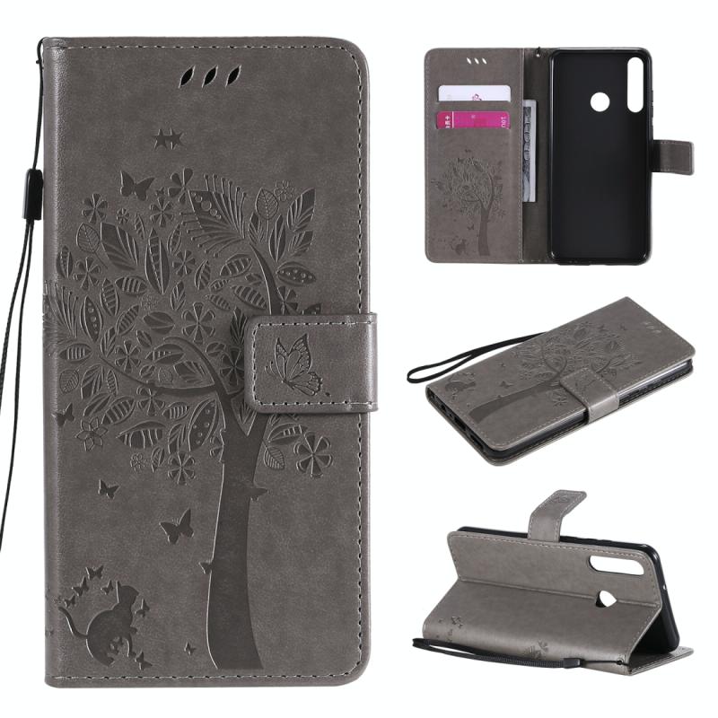 For Huawei Y6p Tree & Cat Embossed Pattern Horizontal Flip Leather Case with Holder & Card Slots & Wallet & Lanyard(Grey)