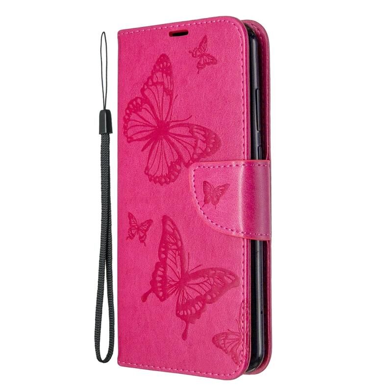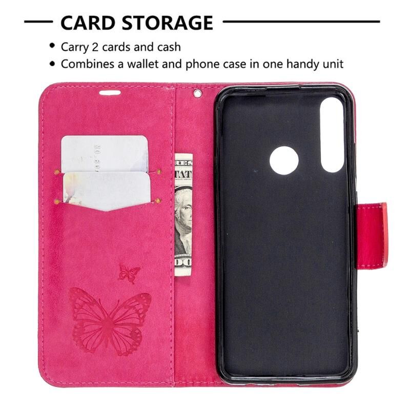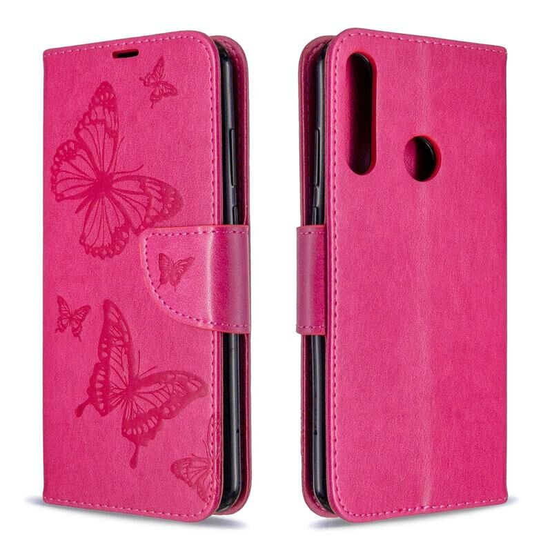 Για Huawei Y6P Δύο πεταλούδες ανάγλυφο μοτίβο οριζόντια Flip δερμάτινη θήκη με κάτοχο & υποδοχή για κάρτες & πορτοφόλι & κορδόνι (Rose Red)