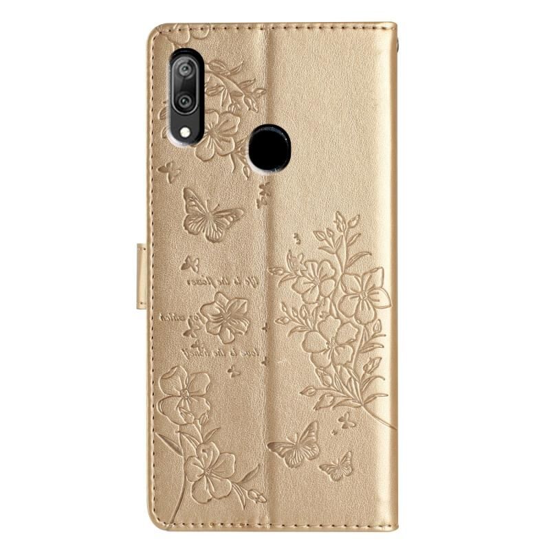 Θήκη τηλεφώνου από δέρμα για Huawei Y7 2019 με σχέδια πεταλούδες και λουλούδια (Χρυσό)