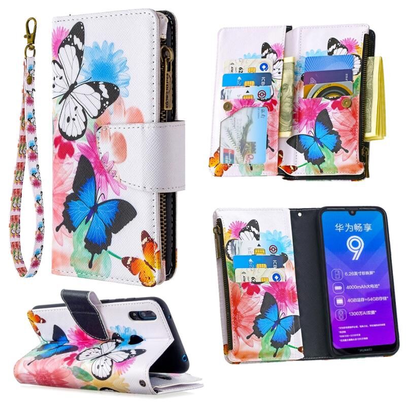 Θήκη Huawei Y7 (2019) με σχέδιο ζωγραφικής, χρώματα, οριζόντια αναδιπλούμενη από δέρμα με φερμουάρ, βάση στήριξης & θήκες για κάρτες & πορτοφόλι (Δύο Πεταλούδες)