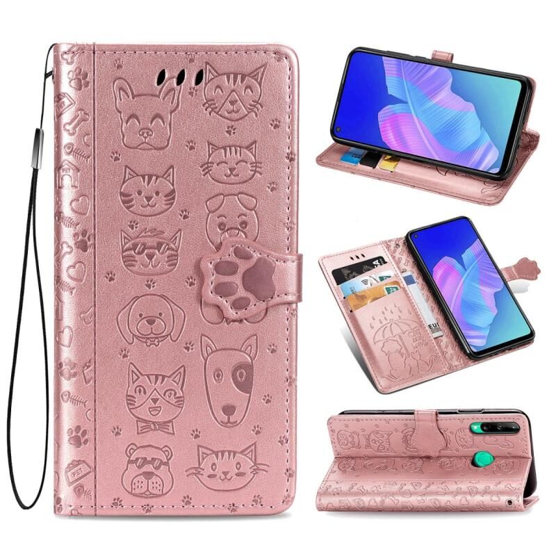 Θήκη Huawei Y7P χαριτωμένης γάτας και σκύλου ανάγλυφης οριζόντιας δερμάτινης με βάση / υποδοχή κάρτας / πορτοφόλι / κορδόνι (Χρυσό ροζ)