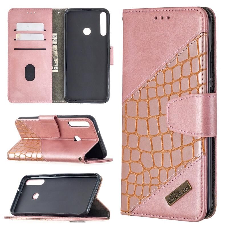 Θήκη Huawei Y7P με χρώμα που ταιριάζει, υφή κροκόδειλου, οριζόντια αναδίπλωση από δερματίνη PU με πορτοφόλι, βάση & υποδοχές καρτών (Χρυσό Ρόδι)
