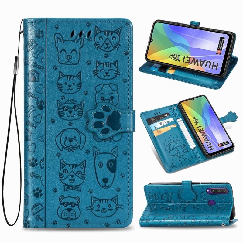 Θήκη δέρματος οριζόντιας αναδίπλωσης με ανάγλυφα σχέδια χαριτωμένων γάτας και σκύλου για Huawei Y8P/ Enjoy 10S, με βάση στήριξης / υποδοχή κάρτας / πορτοφόλι / κορδόνι (Κίτρινο)