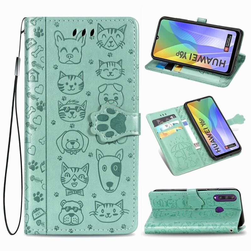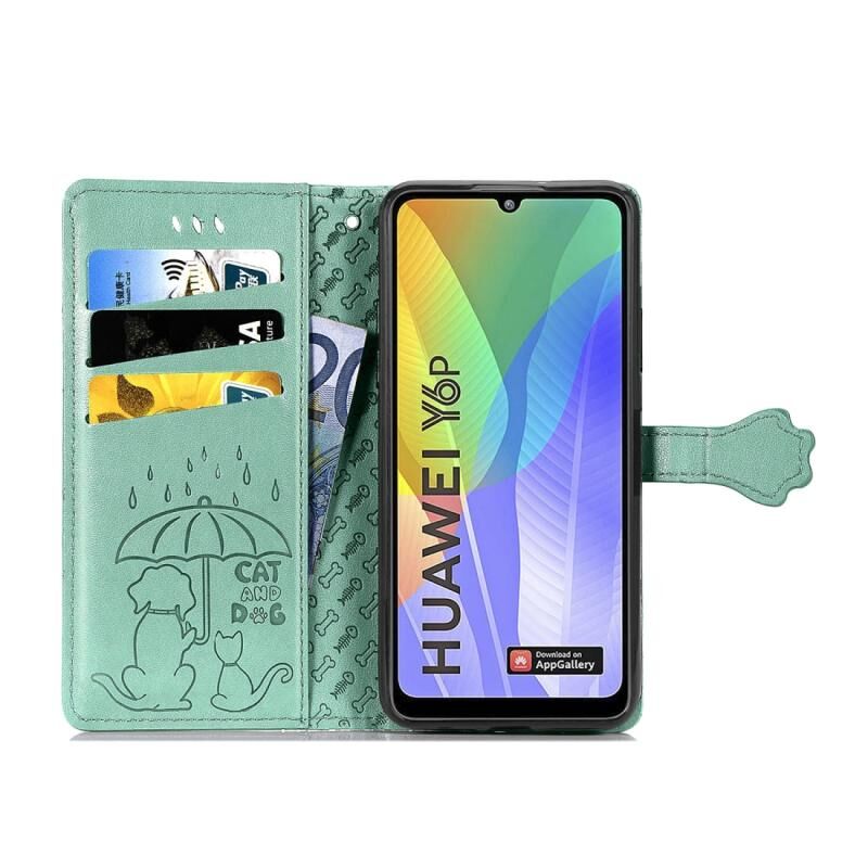 Θήκη δέρματος οριζόντιας αναδίπλωσης με ανάγλυφα σχέδια χαριτωμένων γάτας και σκύλου για Huawei Y8P/ Enjoy 10S, με βάση στήριξης / υποδοχή κάρτας / πορτοφόλι / κορδόνι (Κίτρινο)