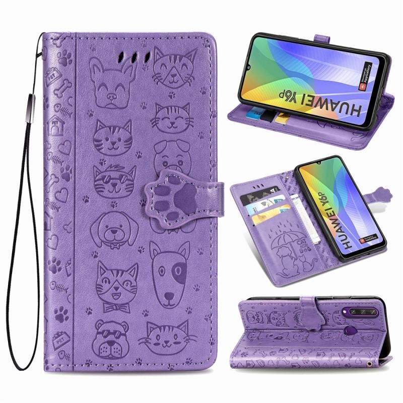Θήκη δέρματος οριζόντιας αναδίπλωσης με ανάγλυφα σχέδια χαριτωμένων γάτας και σκύλου για Huawei Y8P/ Enjoy 10S, με βάση στήριξης / υποδοχή κάρτας / πορτοφόλι / κορδόνι (Μωβ)