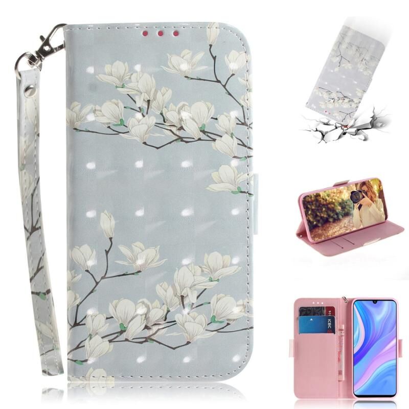 Θήκη δέρματος οριζόντιας αναδίπλωσης με μαγνητική έλξη και τρισδιάστατο σχέδιο για Huawei Y8p / P Smart S / Enjoy 10s, με βάση στήριξης, θήκη για κάρτες, πορτοφόλι και κορδόνι (Μαγνολία).
