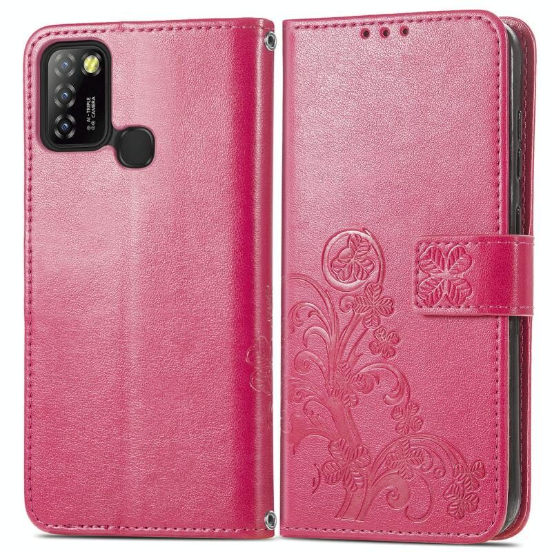 Για το Infinix Hot 10 Lite Four-leaf Clasp ανάγλυφη αγκράφα Κινητό τηλέφωνο προστασία δερμάτινη θήκη με κορδόνι & υποδοχή κάρτας & πορτοφόλι & λειτουργία βραχίονα (Magenta)