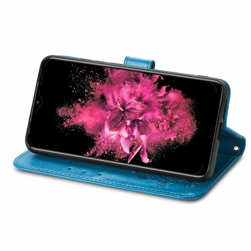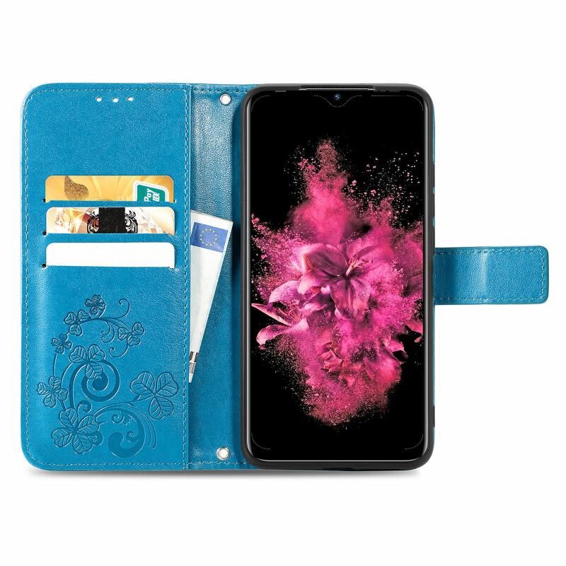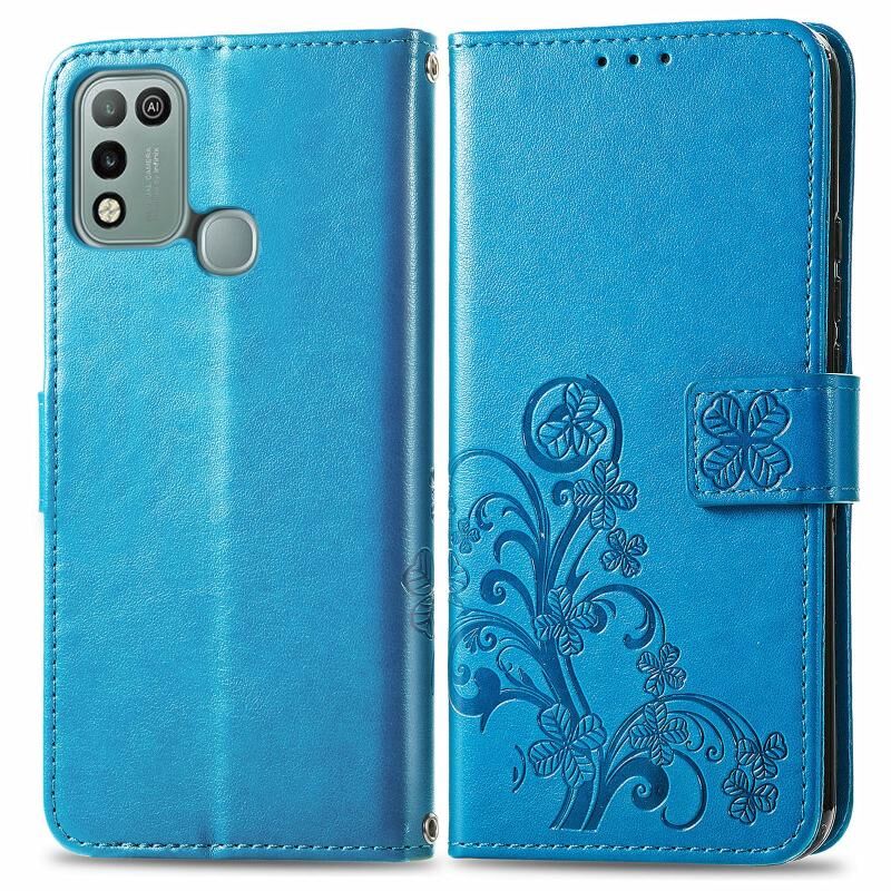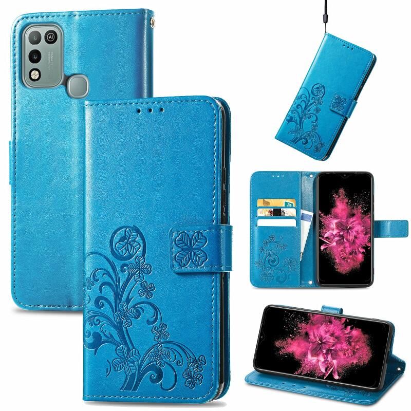 Για το INFINIX Hot 10 Play Four-leaf Clasp ανάγλυφη αγκράφα Κινητό τηλέφωνο προστασία δερμάτινη θήκη με κορδόνι & υποδοχή για κάρτες & πορτοφόλι & λειτουργία βραχίονα (μπλε)