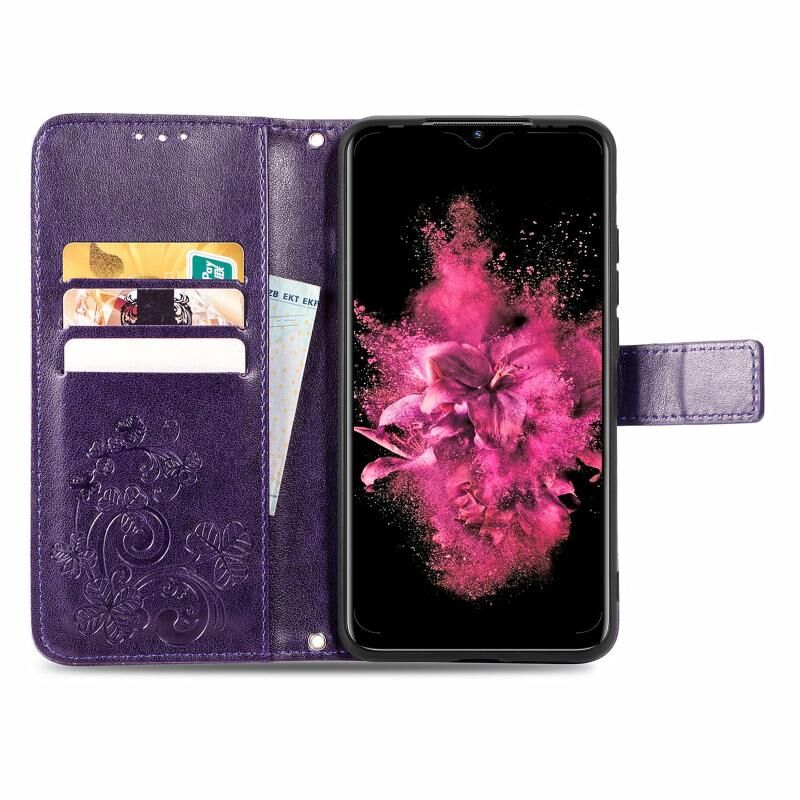 Για INFINIX Hot 10 Play Four-leaf Clasp ανάγλυφη αγκράφα Κινητό τηλέφωνο προστασία δερμάτινη θήκη με κορδόνι & υποδοχή για κάρτες & πορτοφόλι & βραχίονα λειτουργία (μωβ)