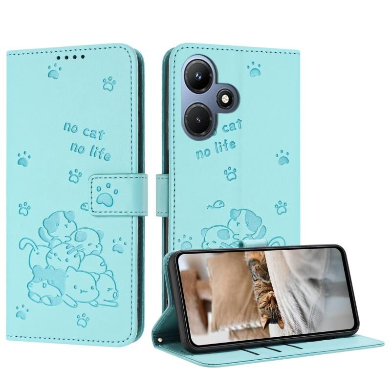Θήκη δερμάτινη για Infinix Hot 30i με ανάγλυφο σχέδιο γατάκι και κορδόνι (Μωβ)