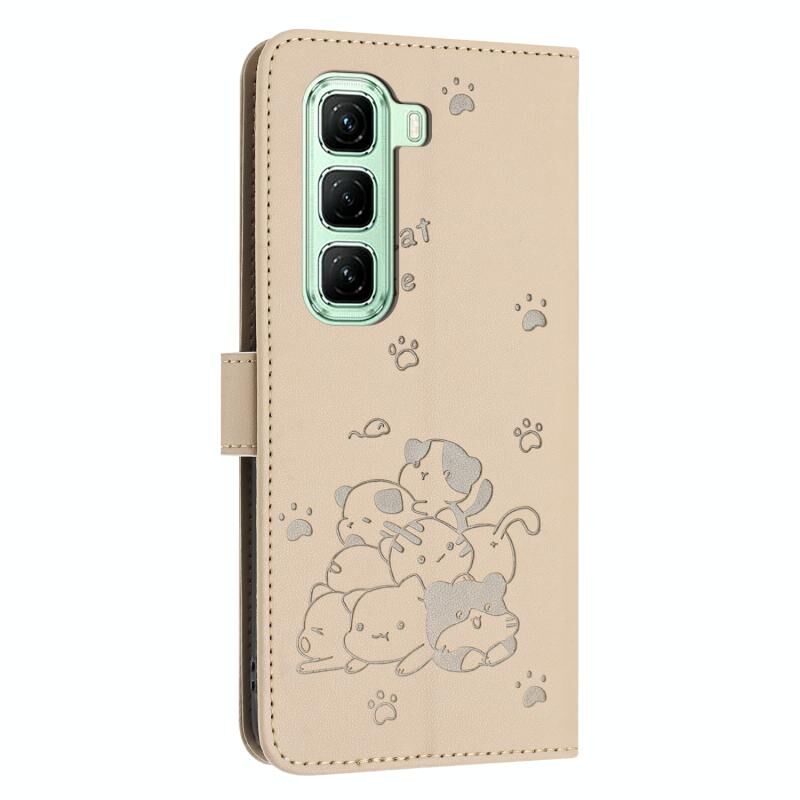 Θήκη δερμάτινη για Infinix Hot 50 4G με ανάγλυφο σχέδιο γατάκι και κορδόνι (Μπεζ)
