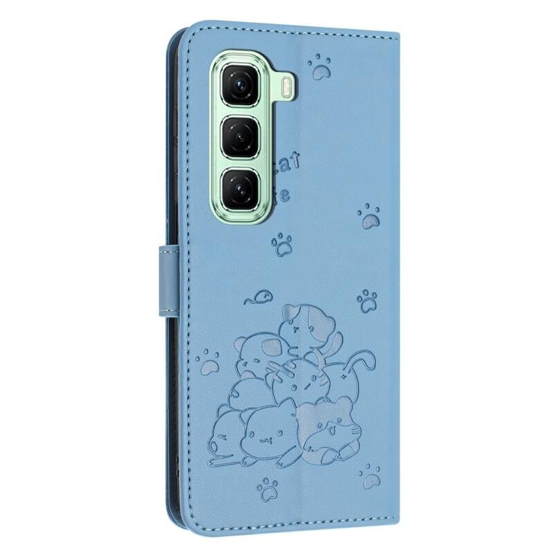 Θήκη δερμάτινη για Infinix Hot 50 5G με ανάγλυφο σχέδιο γατάκι και κορδόνι (Μωβ)