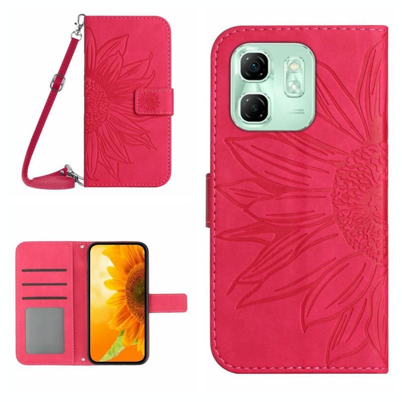 Θήκη τηλεφώνου από δέρμα με σχέδιο λουλουδιών και ανάγλυφη υφή για Infinix Hot 50i 4G, με λουρί (Κόκκινο)