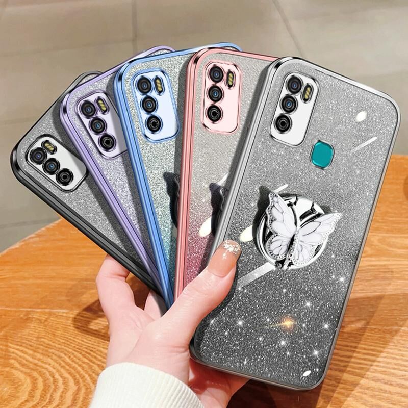 Για Infinix Hot 9 Play Plated βαθμιδωτή Glitter πεταλούδα κάτοχος TPU τηλέφωνο υπόθεση (ροζ)