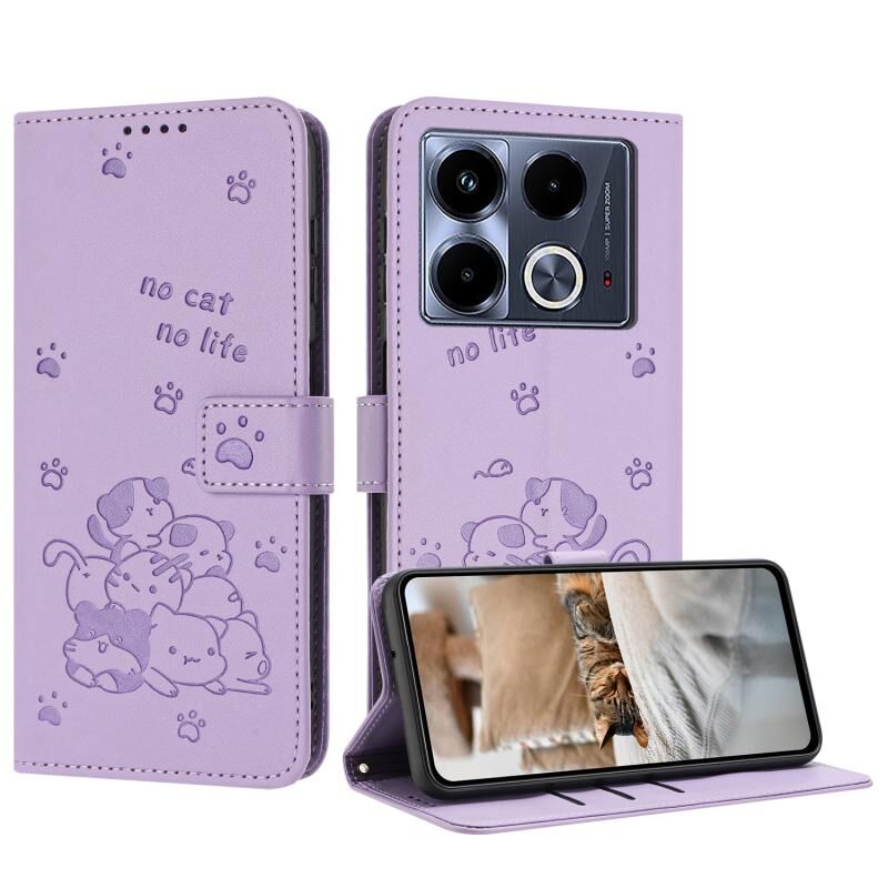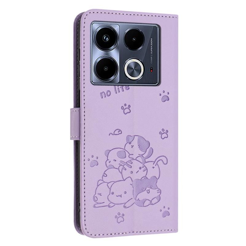 Θήκη δερμάτινη για Infinix Note 40 4G με ανάγλυφο σχέδιο γατάκι και κορδόνι (Μωβ)