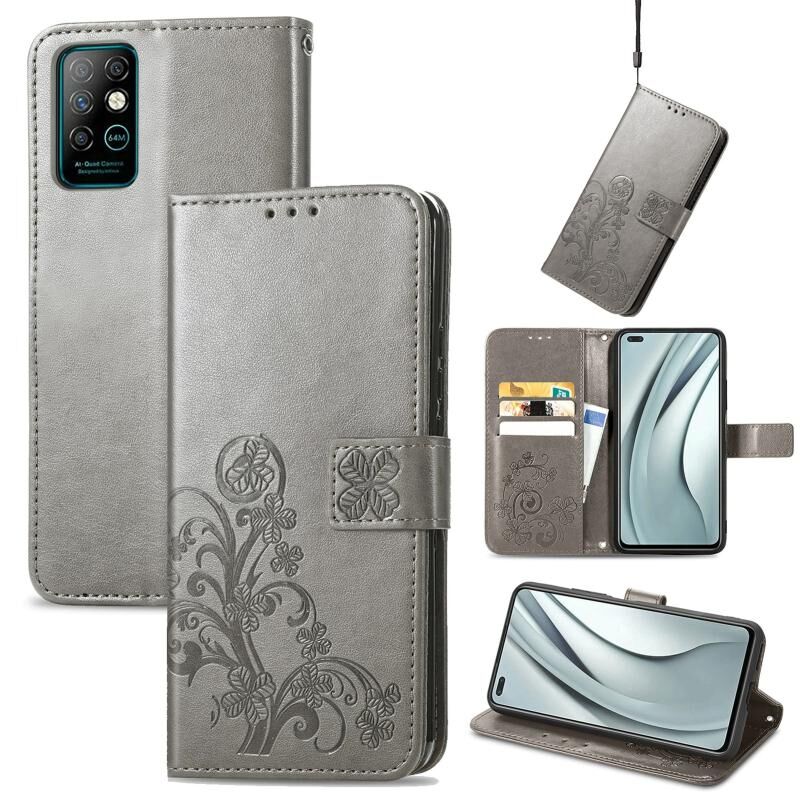 Για το Infinix Note 8 Four-leaf Clasp ανάγλυφη αγκράφα Κινητό τηλέφωνο προστασία δερμάτινη θήκη με κορδόνι & υποδοχή για κάρτες & πορτοφόλι & λειτουργία βραχίονα (γκρι)