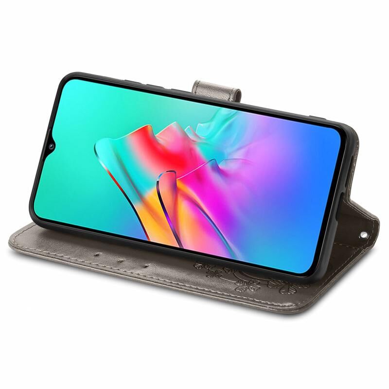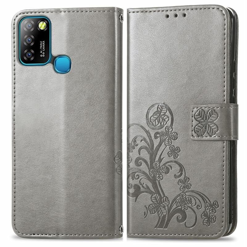 Για το Infinix Smart 5 Four-leaf Clasp ανάγλυφη αγκράφα Κινητό τηλέφωνο προστασία δερμάτινη θήκη με κορδόνι & υποδοχή για κάρτες & πορτοφόλι & λειτουργία βραχίονα (γκρι)