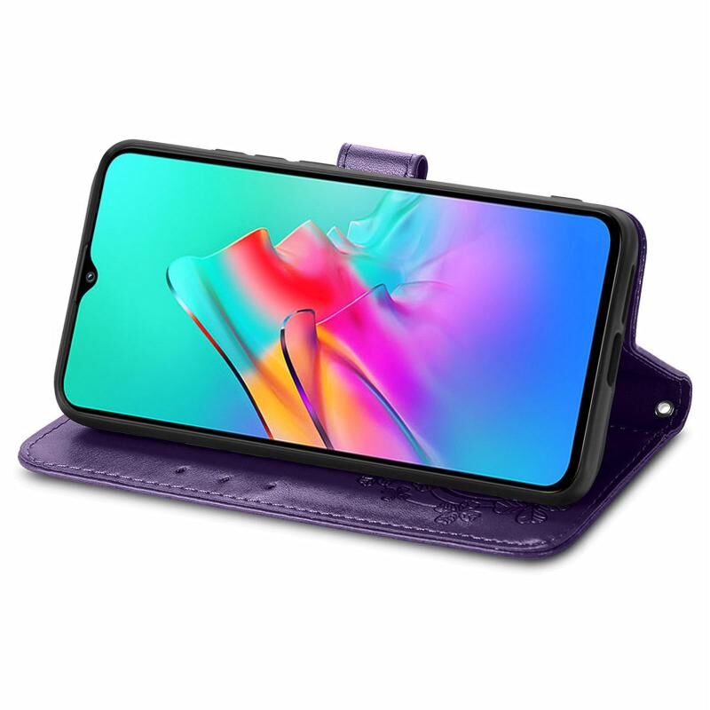 Για το Infinix Smart 5 Four-leaf Clasp ανάγλυφη αγκράφα Κινητό τηλέφωνο προστασία δερμάτινη θήκη με κορδόνι & υποδοχή για κάρτες & πορτοφόλι & βραχίονα λειτουργία (μωβ)