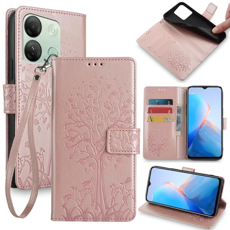 Για το Infinix Smart 7 HD δέντρο & ελάφι ανάγλυφη δερμάτινη θήκη τηλεφώνου (ροζ χρυσό)