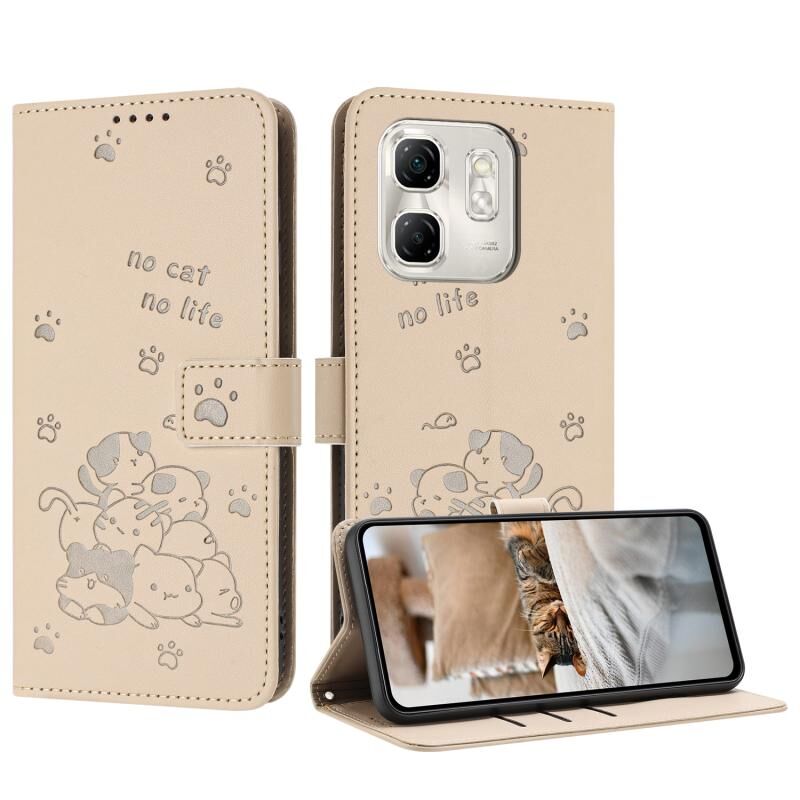 For Infinix Smart 9 5G / Hot 50i 5G Embossed Kitten Phone Leather Case with Lanyard(Beige)