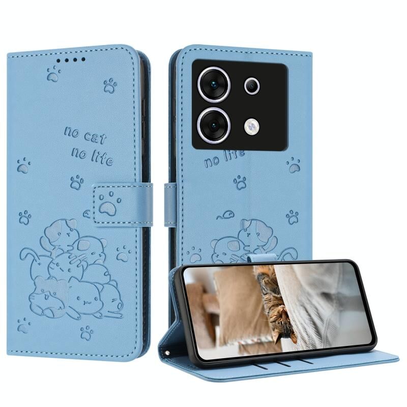 Θήκη δερμάτινη για Infinix Zero 30 5G με ανάγλυφο σχέδιο γατάκι και κορδόνι (Μωβ)