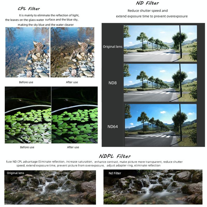 3. ND Filter: You can get more freedom to control aperture and shutter, bring more exposure methods and creative space for photography creation, and effectively prevent overexposure. The number behind ND represents the ability of the ND mirror to block light.