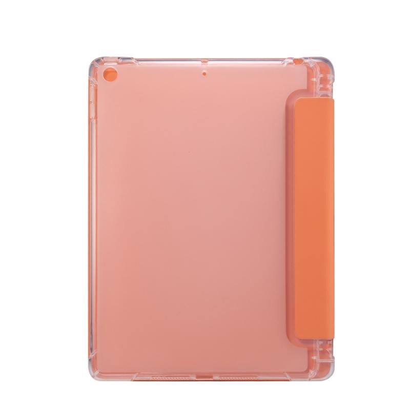 For iPad 10.2 2021 / 2020 / 2019 3-folding Electric Pressed Skin Texture Horizontal Flip Shockproof Transparent TPU + PU Leather Case with Holder & Pen Slot & Sleep / Wake-up Function(Orange)