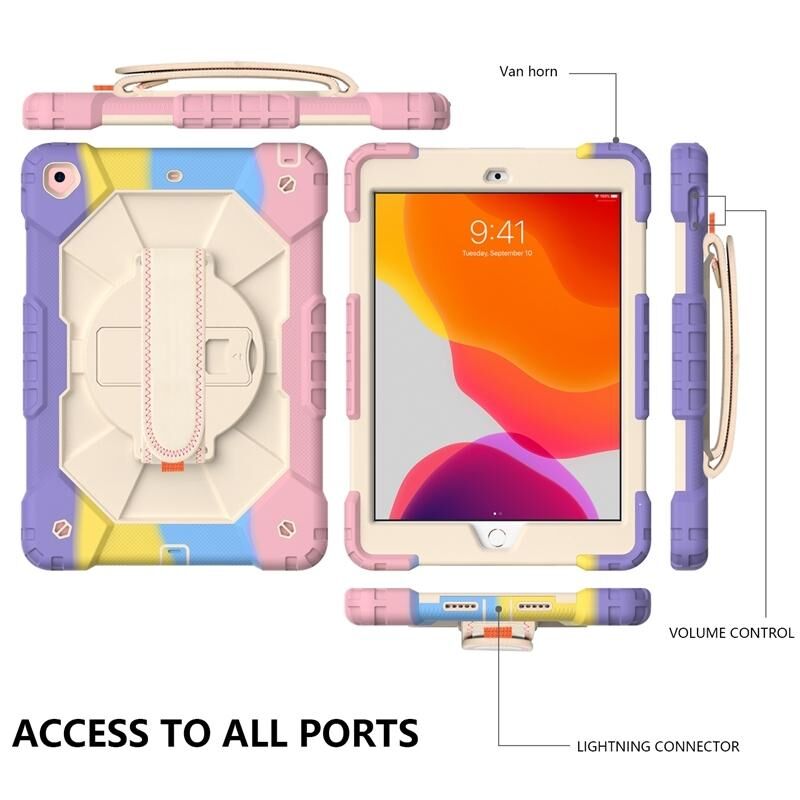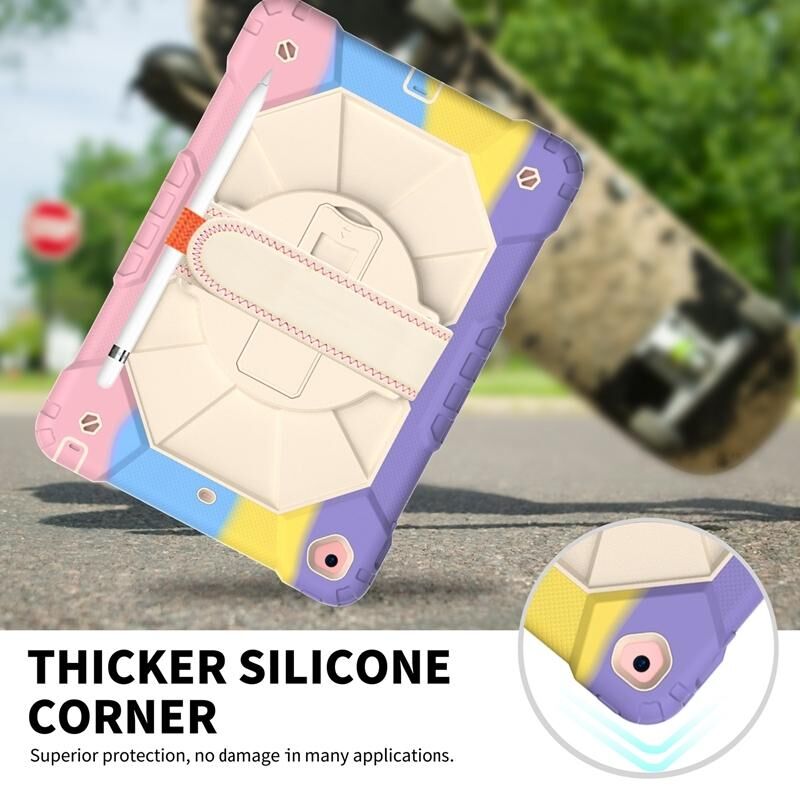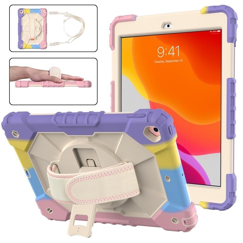 For iPad 10.2 2021 / 2020 / 2019 Contrast Color Robot Shockproof Silicon + PC Protective Case with Holder & Shoulder Strap(Colorful Purple Beige)