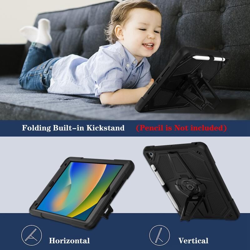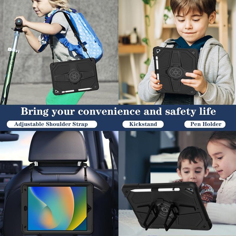 3. Adjustable Shoulder Strap: Adjustable shoulder grip can be slanted and release your hands completely. This function is perfect for traveling, restaurant ordering, home product introduction, engineer outdoor operation, teacher, etc. Also, the strap allows you to hang up your tablet behind car seat for entertainment for kids.