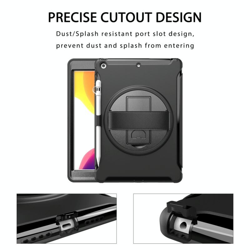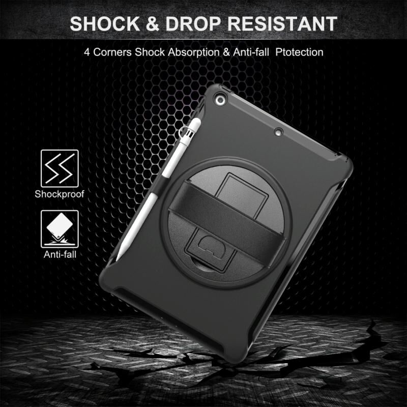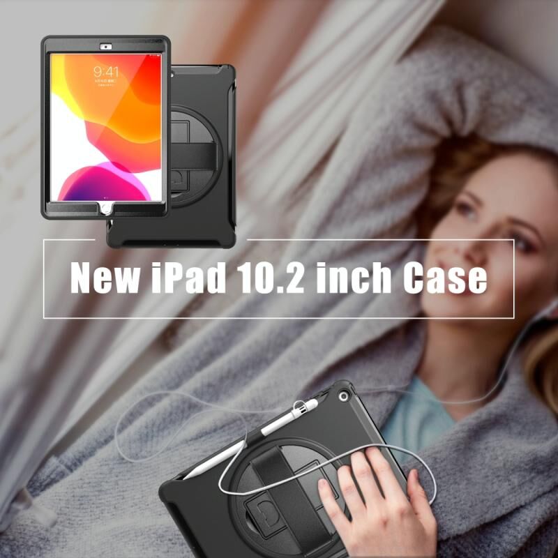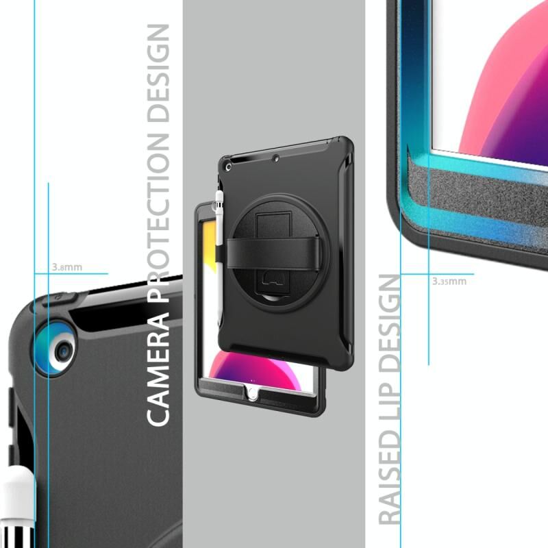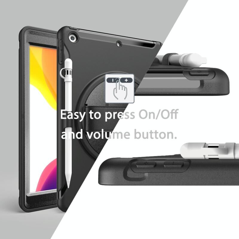 Θήκη προστασίας 360 μοιρών για iPad 10.2 από PC+TPU με βάση στήριξης, λουρί χειρός και θήκη για στυλό (Μαύρο)