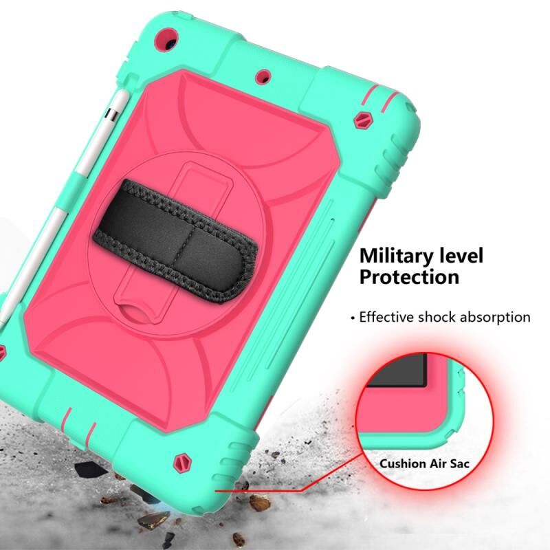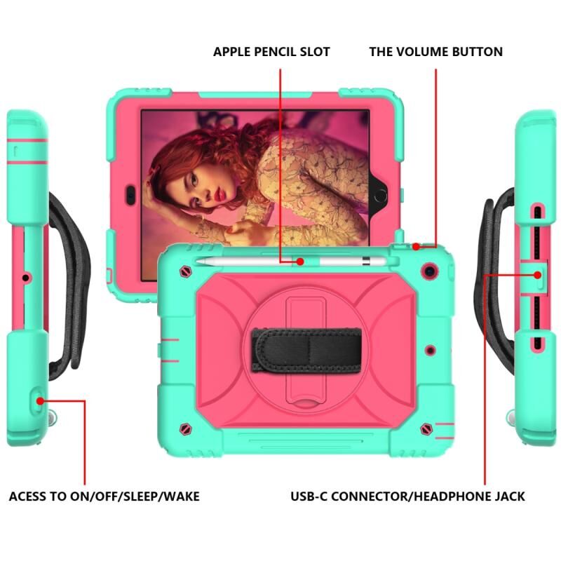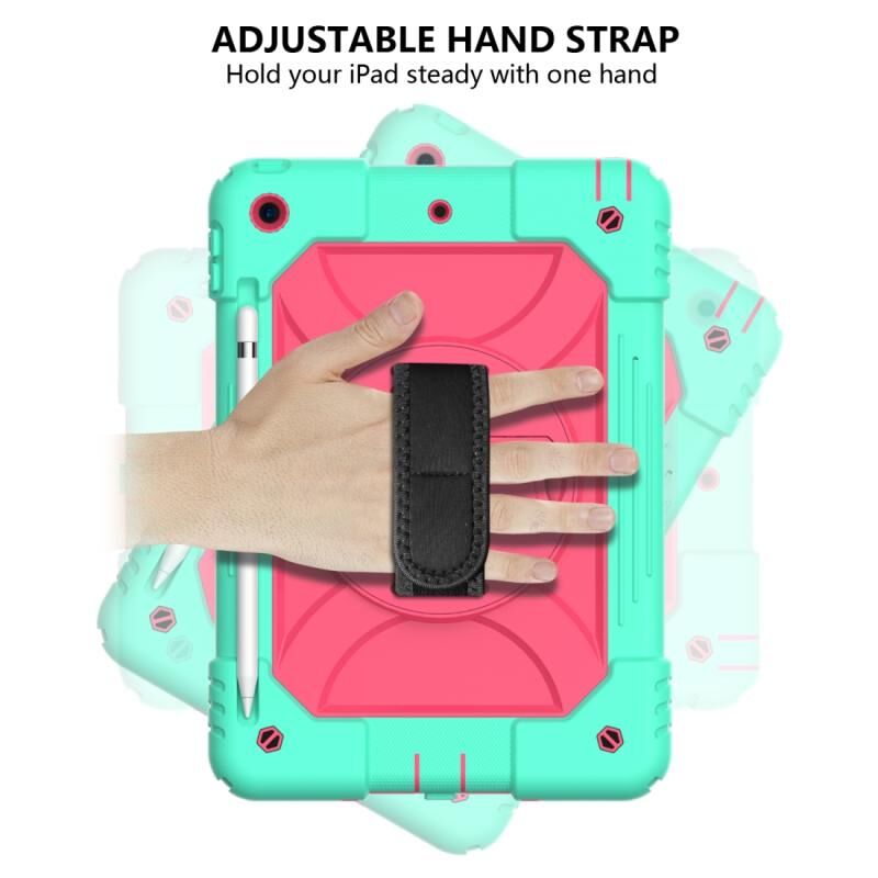Θήκη για iPad 10.2, ανθεκτική σε κρούσεις, συνδυασμός PC + Σιλικόνης με βάση στήριξης & λουρί χειρός & λουρί ώμου (Μέντα Πράσινο + Ροζ Κόκκινο)