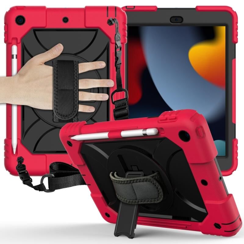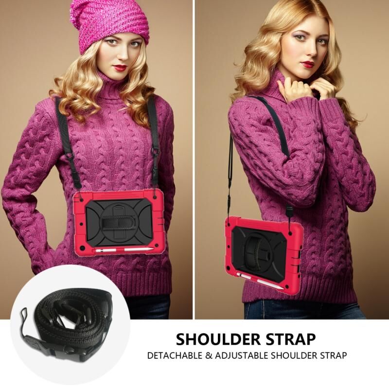 Θήκη για iPad 10.2, ανθεκτική σε κρούσεις, συνδυασμός PC + Σιλικόνης με βάση στήριξης & λουρί χειρός & λουρί ώμου (Μέντα Πράσινο + Ροζ Κόκκινο)