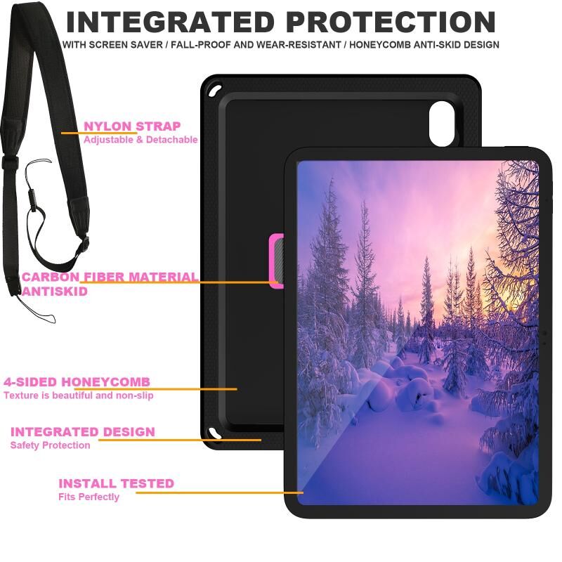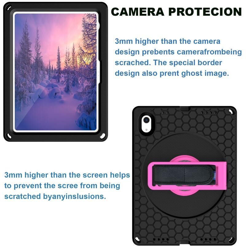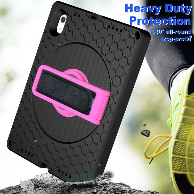 For iPad 2025 / 2022 360 Rotation Stand EVA Hard PC Tablet Case with Strap(Black+Rose)
