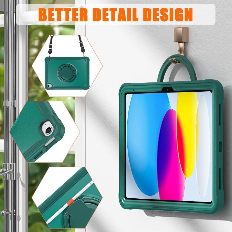 3. Adjustable Shoulder Strap: Adjustable shoulder grip can be slanted and release your hands completely. This function is perfect for traveling, restaurant ordering, home product introduction, engineer outdoor operation, teacher, etc. Also, the strap allows you to hang up your tablet behind car seat for entertainment for kids.