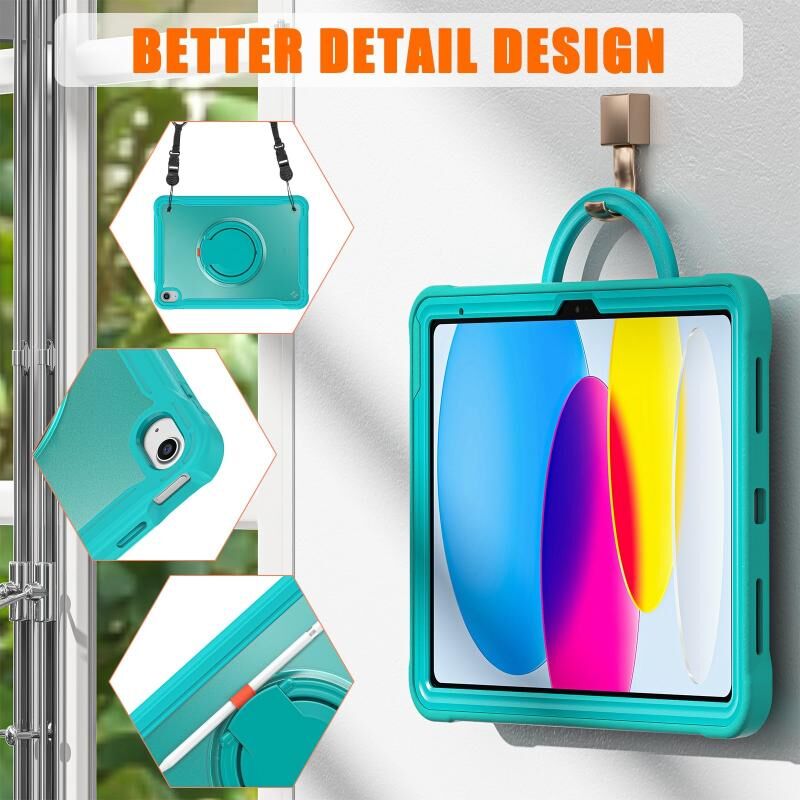 3. Adjustable Shoulder Strap: Adjustable shoulder grip can be slanted and release your hands completely. This function is perfect for traveling, restaurant ordering, home product introduction, engineer outdoor operation, teacher, etc. Also, the strap allows you to hang up your tablet behind car seat for entertainment for kids.