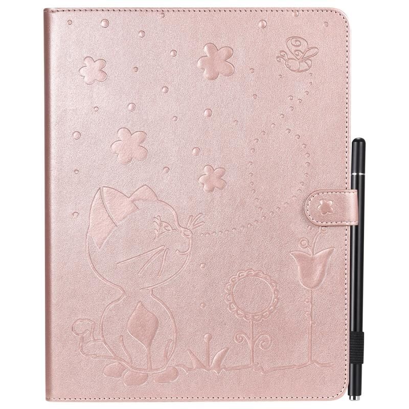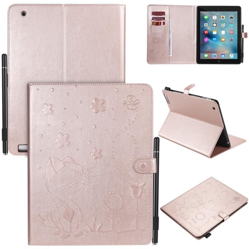 Θήκη δέρματος οριζόντιας αναδίπλωσης με ανάγλυφο σχέδιο γάτας και μέλισσας για iPad 4 / 3 / 2 με βάση στήριξης & υποδοχές καρτών & πορτοφόλι & θήκη στυλό & λειτουργία αφύπνισης / ύπνου (Χρυσό ροζ)