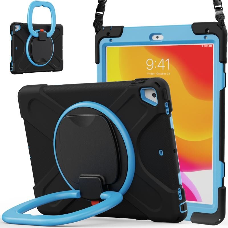 For iPad 9.7 inch (2018/2017) Silicone + PC Protective Case with Holder & Shoulder Strap(Black+Blue)