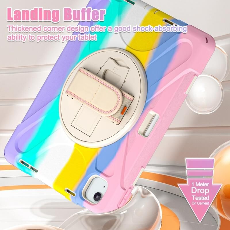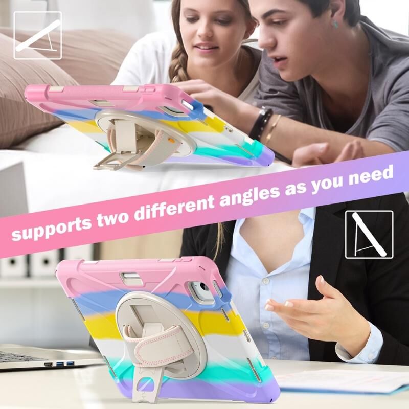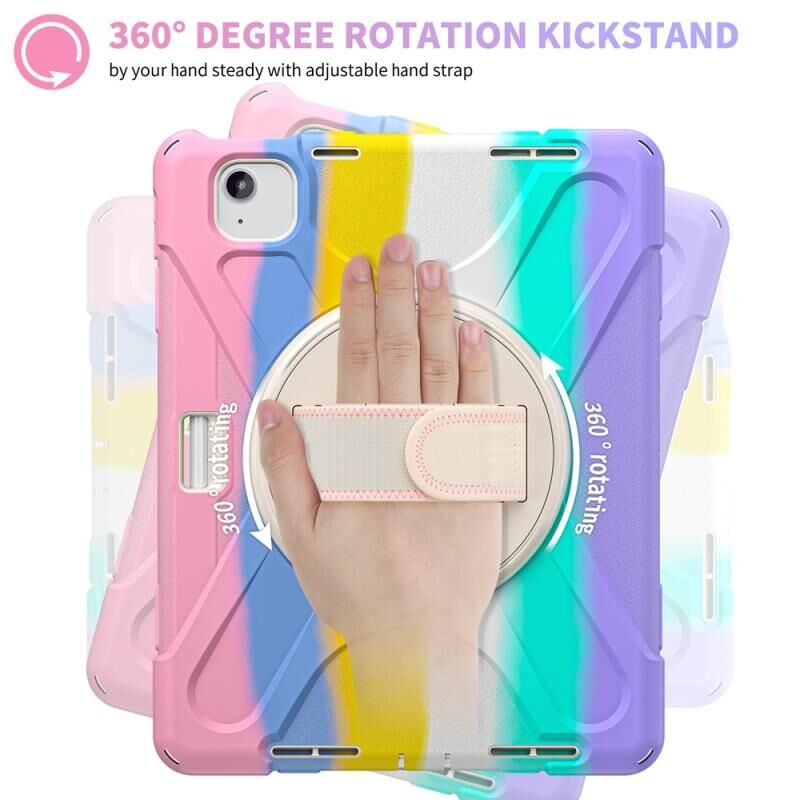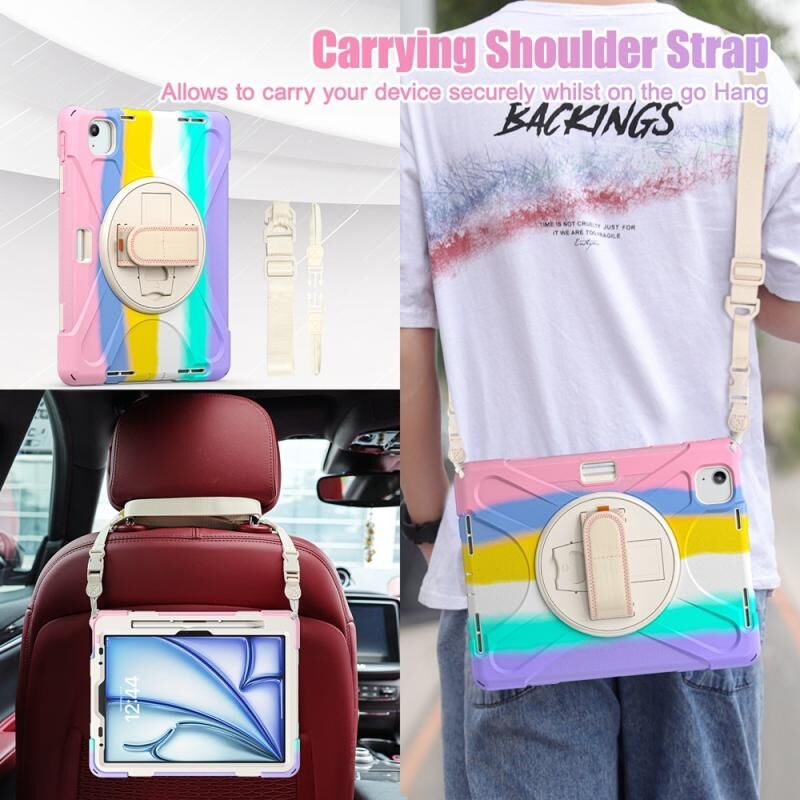 For iPad Air 11 2024 / Air 11 2025 Rotatable Holder Silicone Hybrid PC Tablet Case with Shoulder Strap(Colorful Pink)