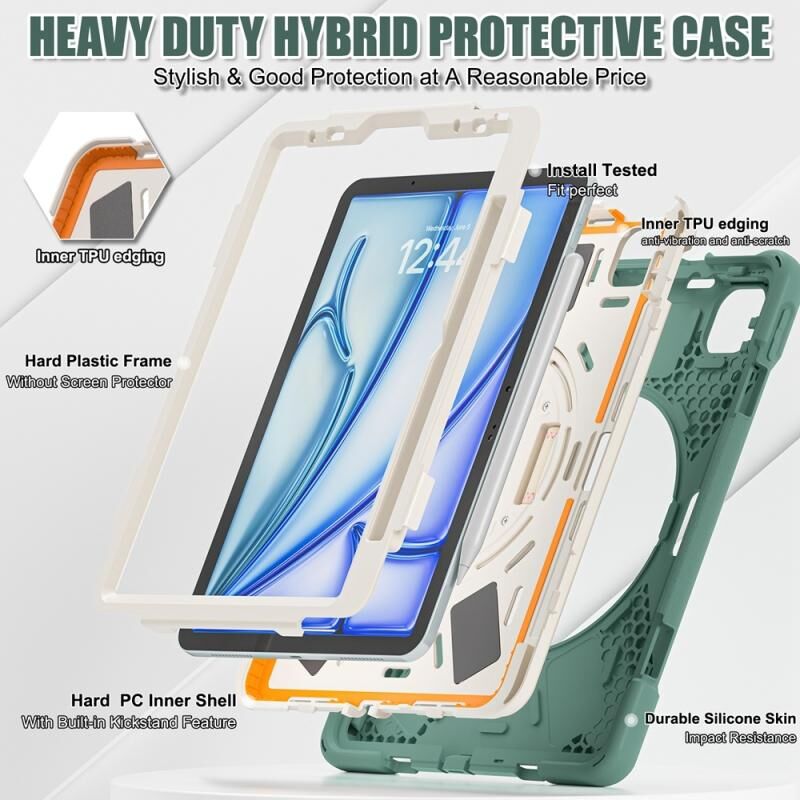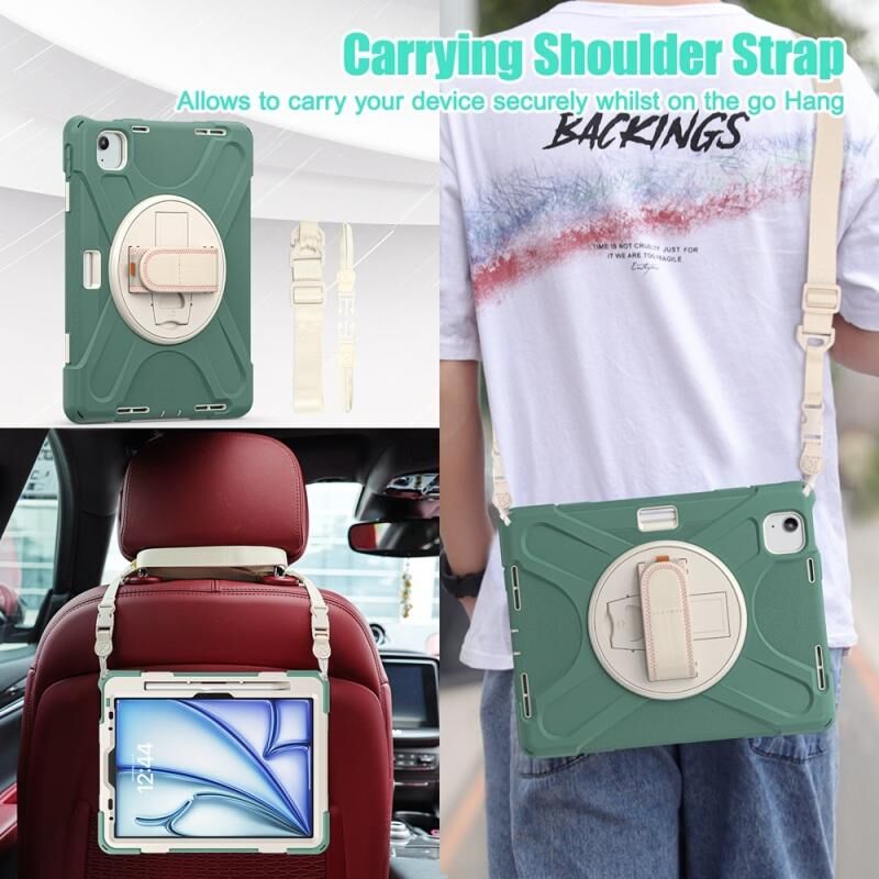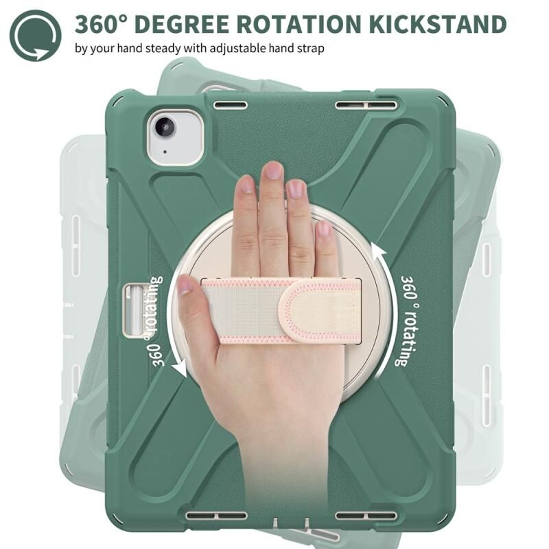 For iPad Air 11 2024 / Air 11 2025 Rotatable Holder Silicone Hybrid PC Tablet Case with Shoulder Strap(Emreald Green)