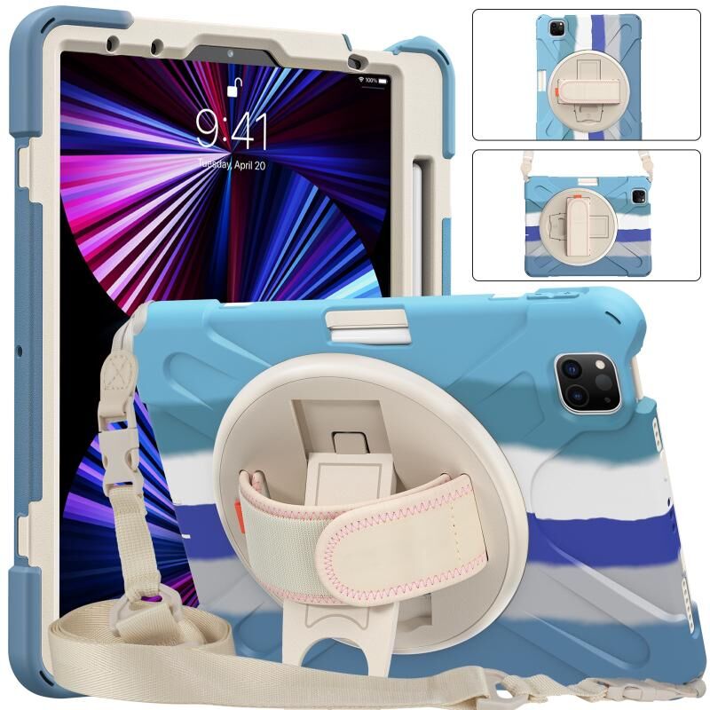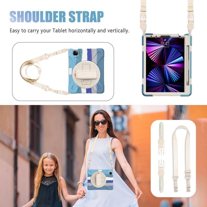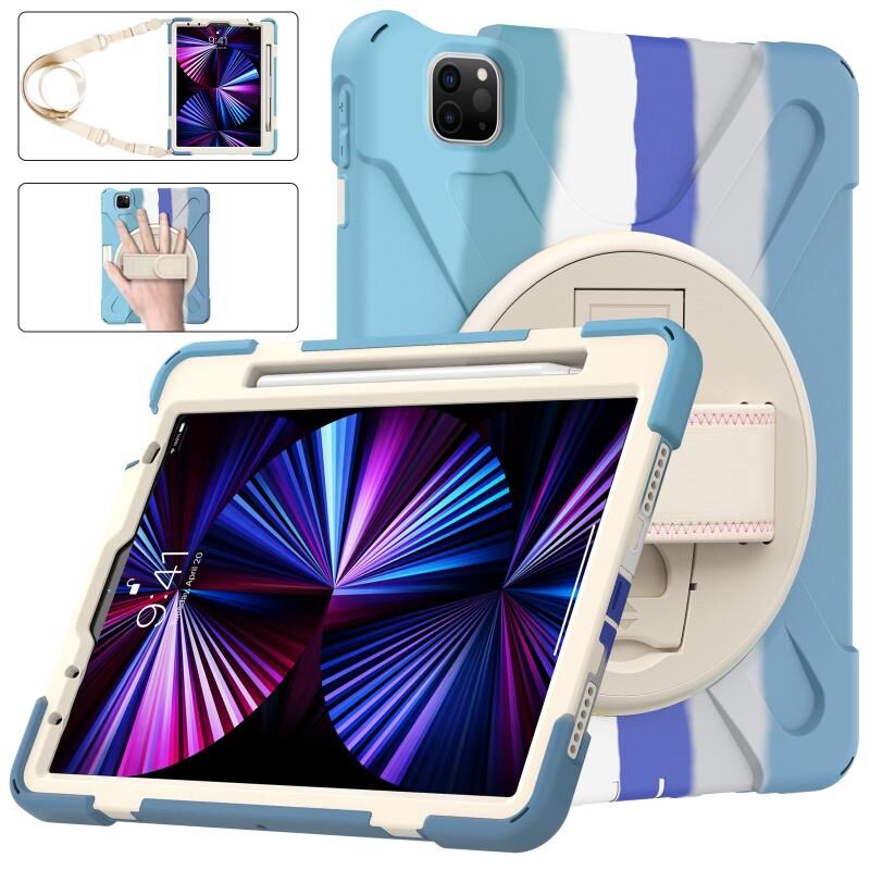 For iPad Air 11 2024 / Air 5 10.9 2022 / Air 4 10.9 2020 / Pro 11 2022 /2021 / 2018 / 2020 Silicone + PC Protective Tablet Case with Holder & Shoulder Strap(Colorful Blue)