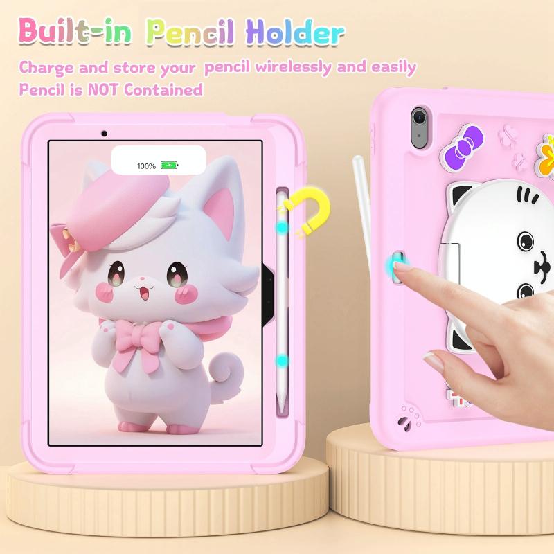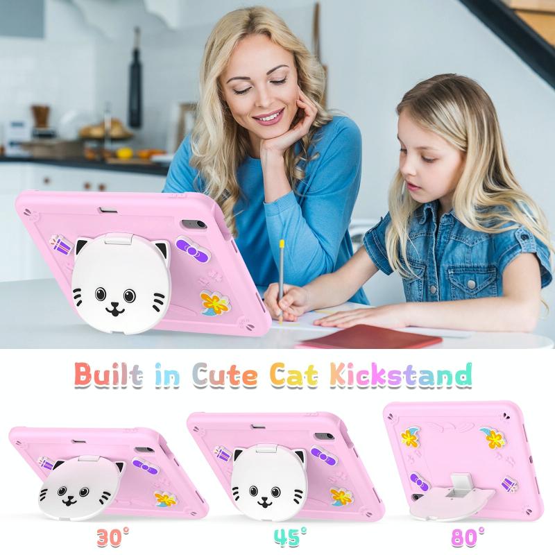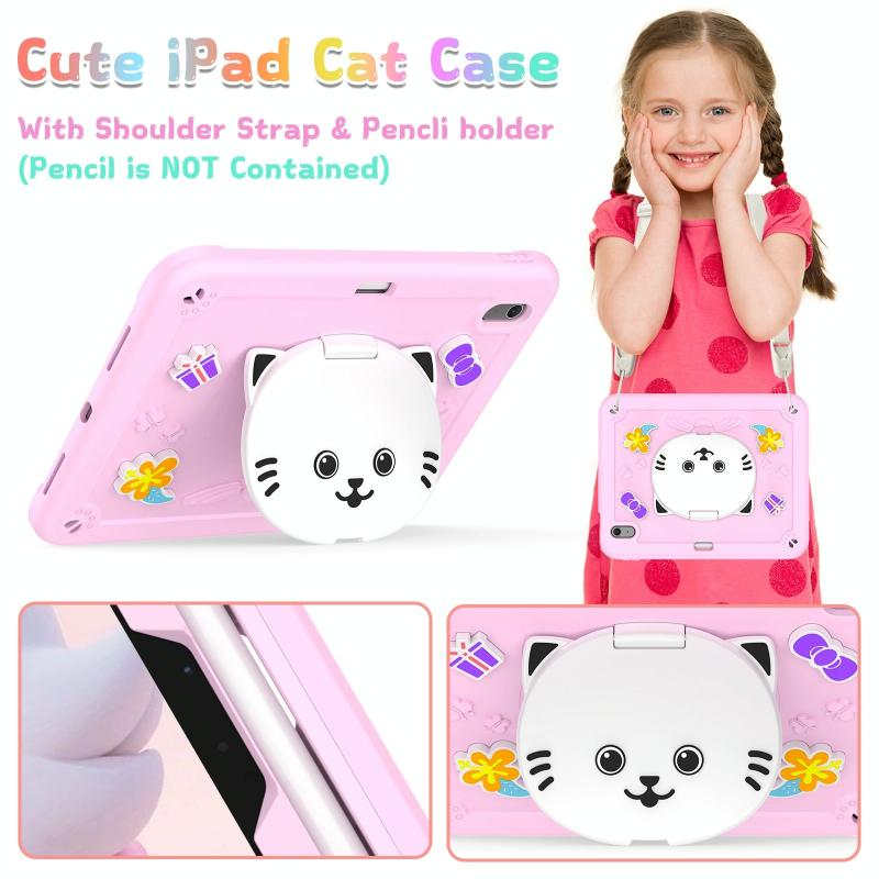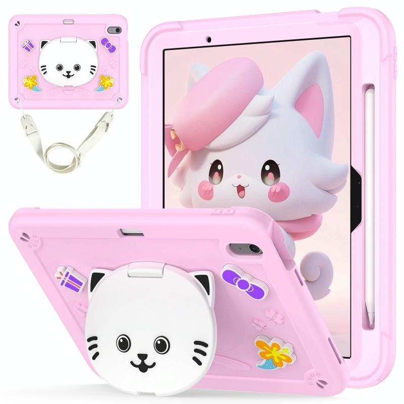 For iPad Air 11 2025 / 2024 Cat Holder Silicone Hybrid PC Tablet Case with Strap(Cherry Blossom Pink)